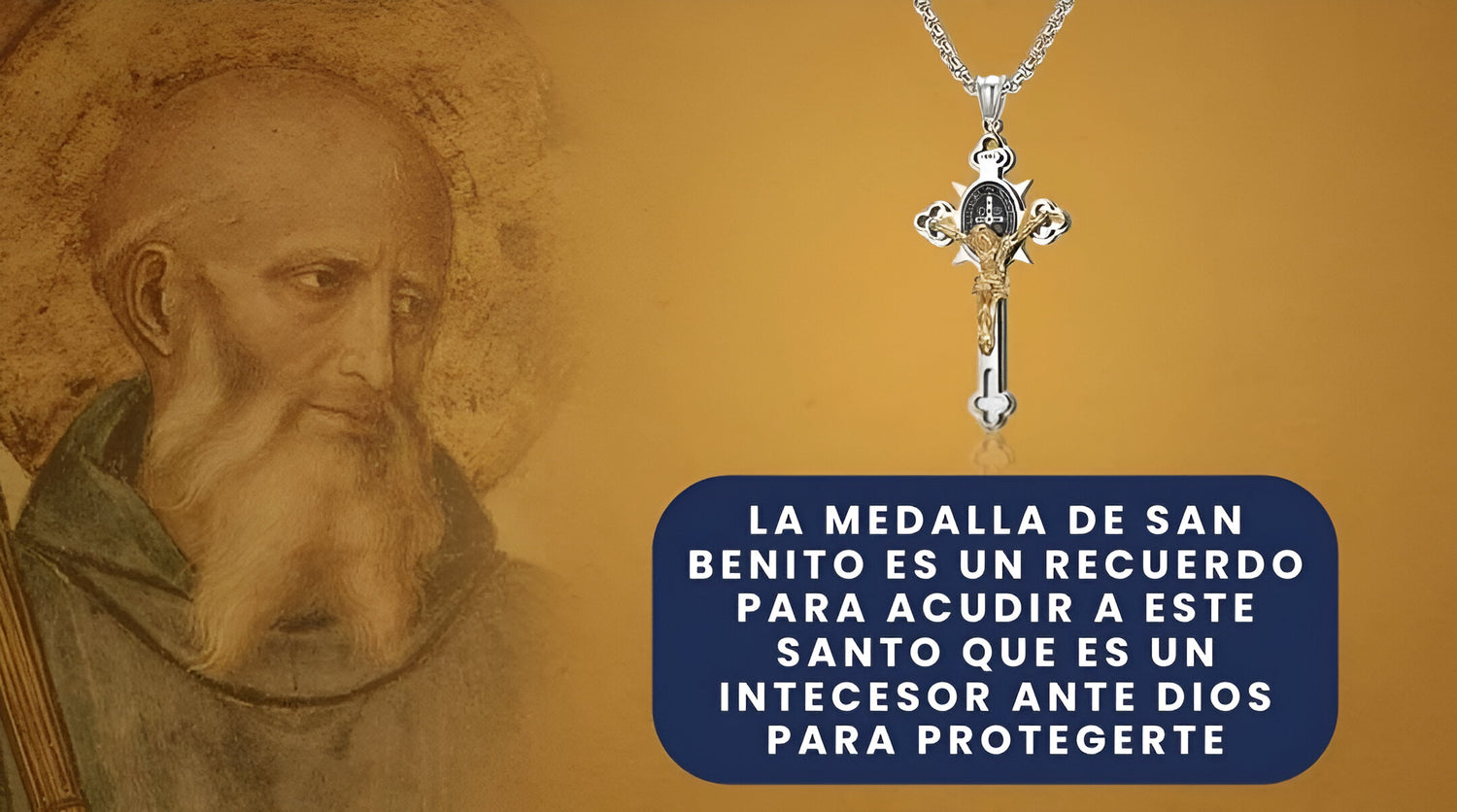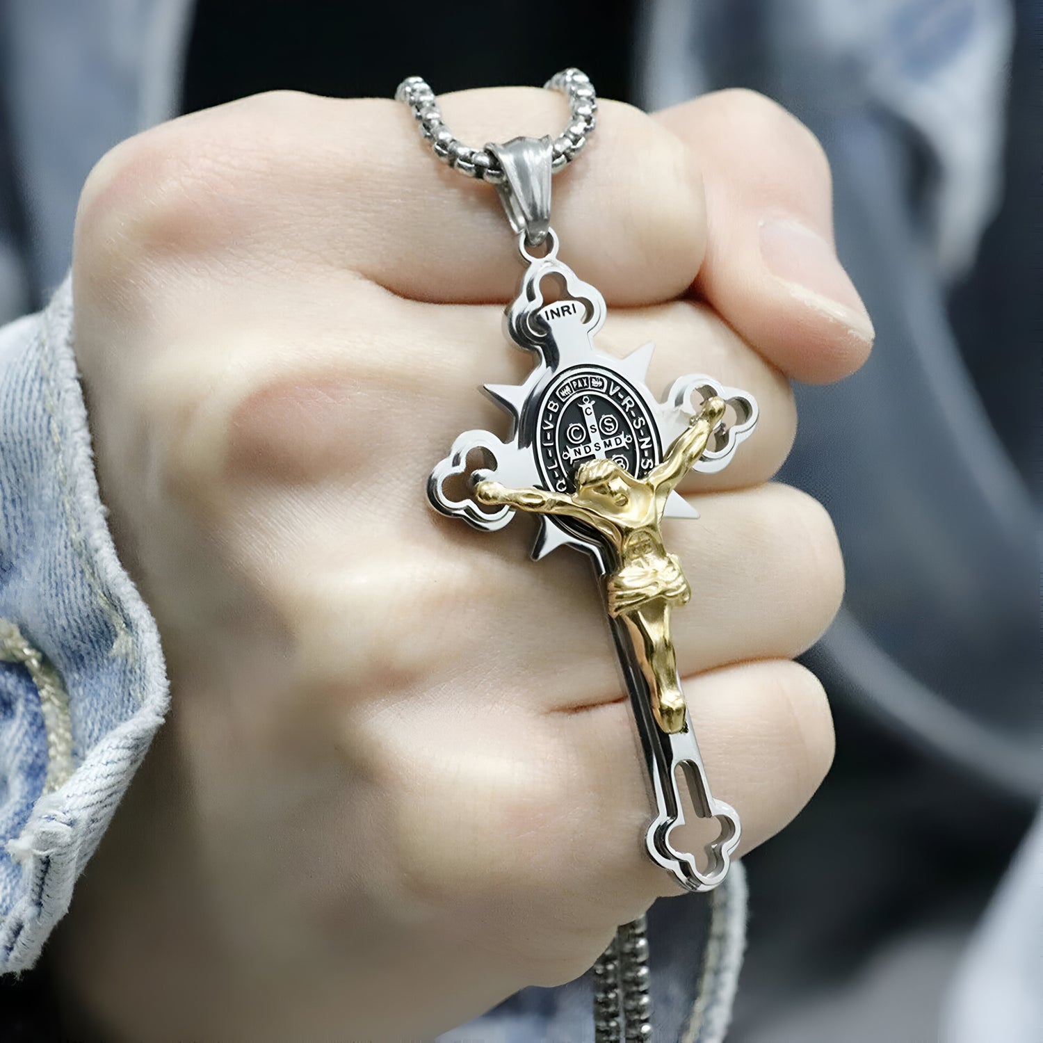 La medalla de San Benito, situada al respaldo de la poderosa cruz de Cristo, es reconocida mundialmente por su gran protección contra las influencias negativas, siendo un testimonio de un poderoso llamado al buen augurio.
