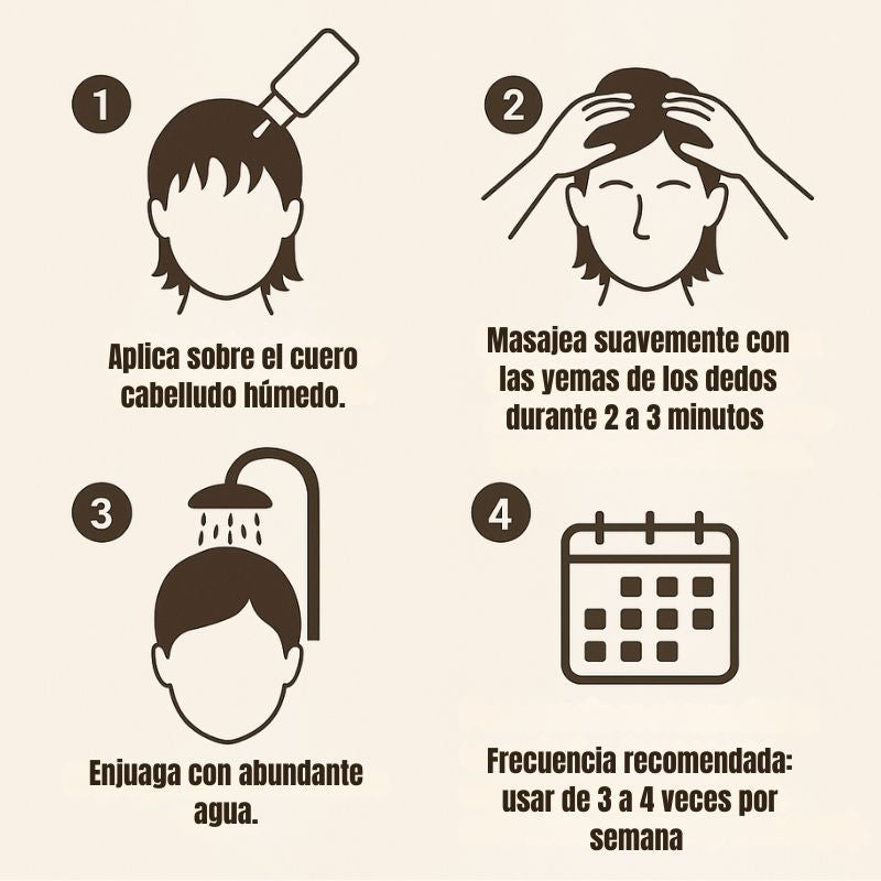 -Aplicación: Masajear 2-3 min sobre cuero cabelludo húmedo y enjuagar