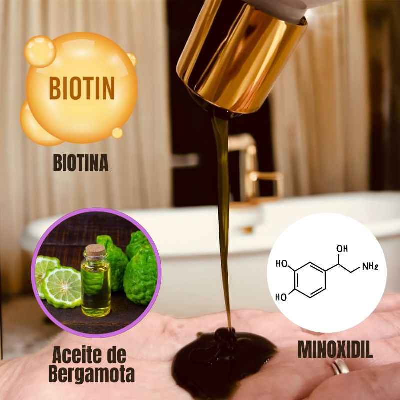-Activos principales: Minoxidil 5 % + Biotina + Bergamota