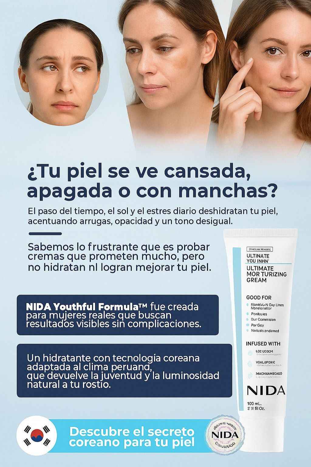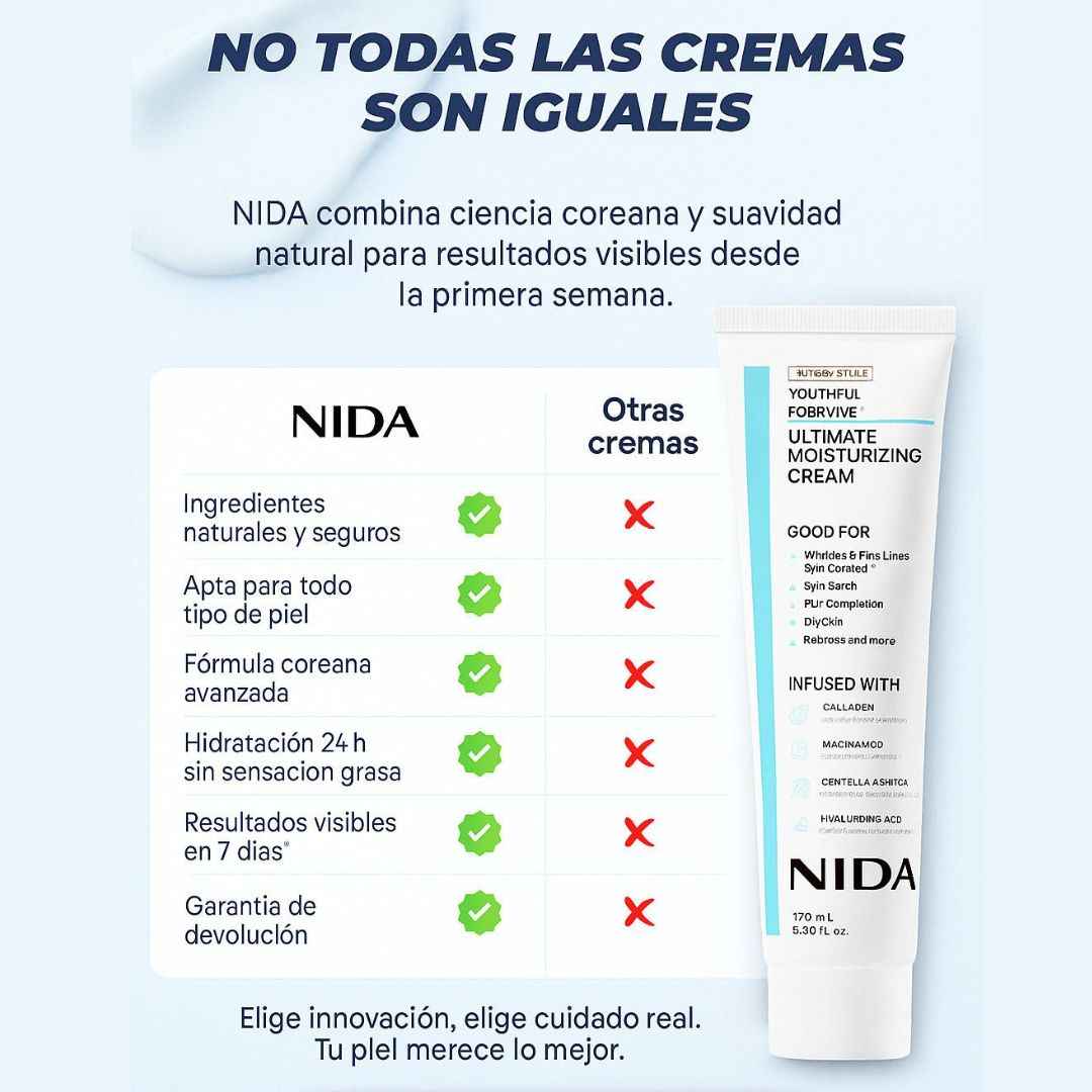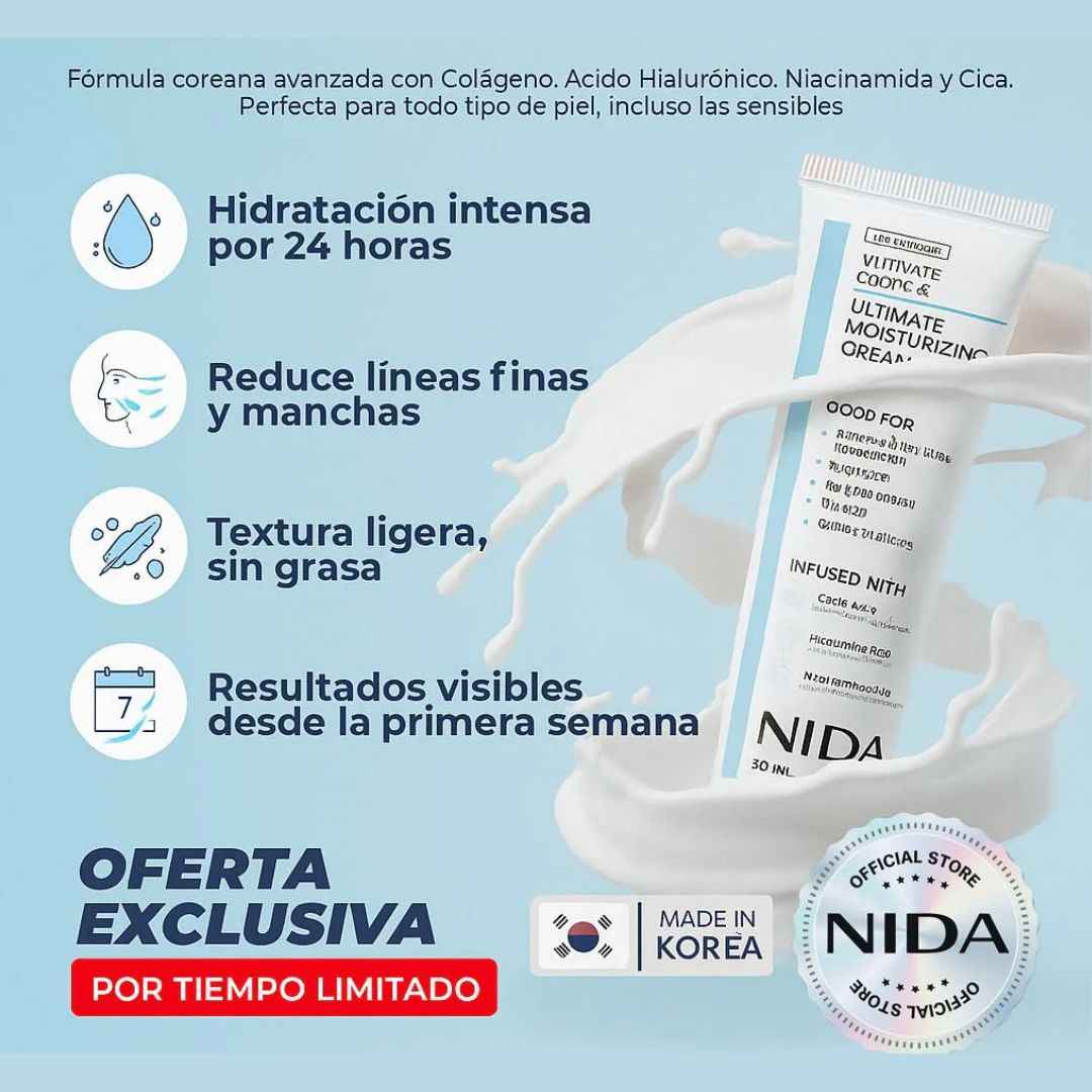 Despídete de arrugas, manchas y ojeras con NIDA, una fórmula avanzada inspirada en el skincare coreano que hidrata profundamente, mejora la textura y devuelve luminosidad visible desde los primeros días.