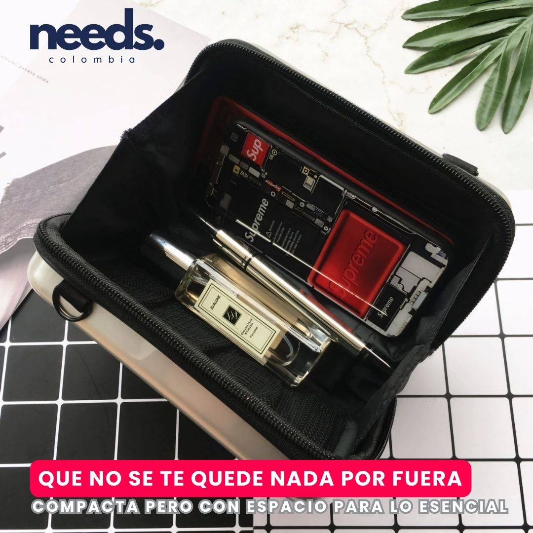 Su diseño innovador te permite llevar desde tus cosméticos y dispositivos electrónicos hasta tus accesorios personales, todo en un solo lugar.