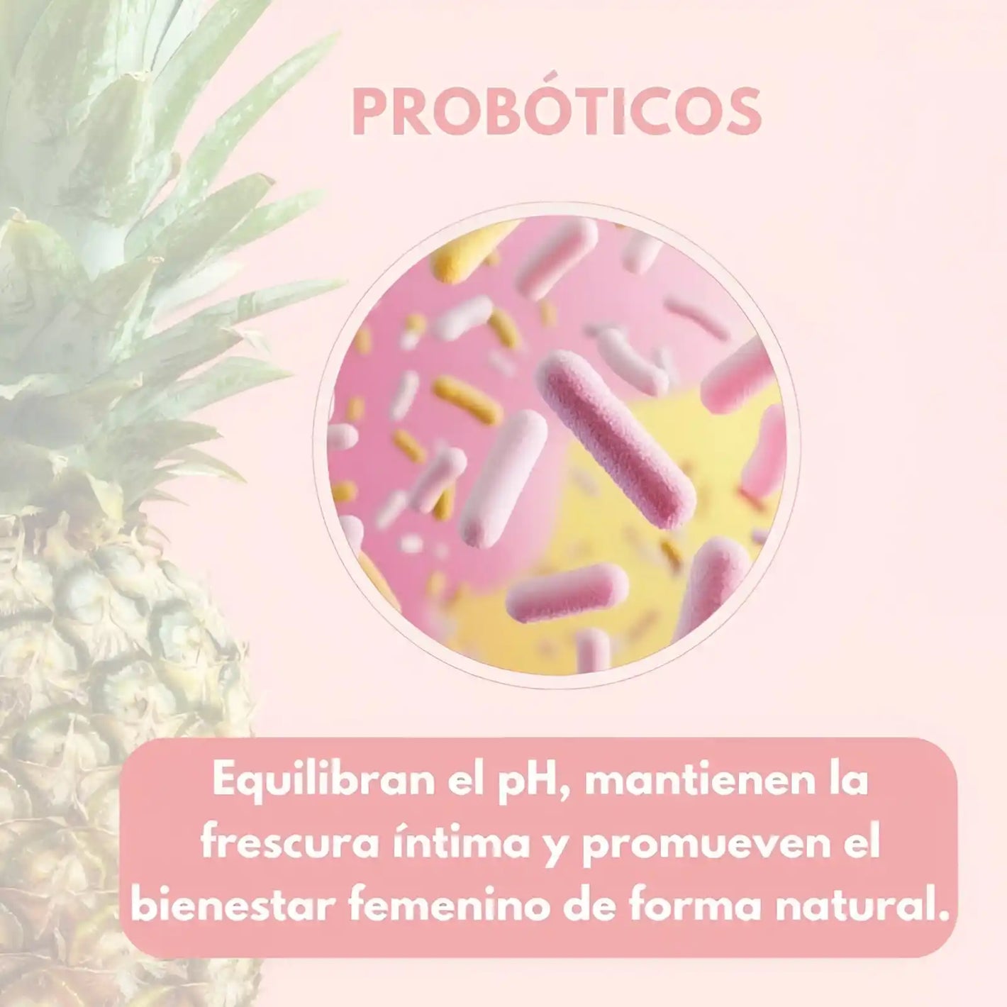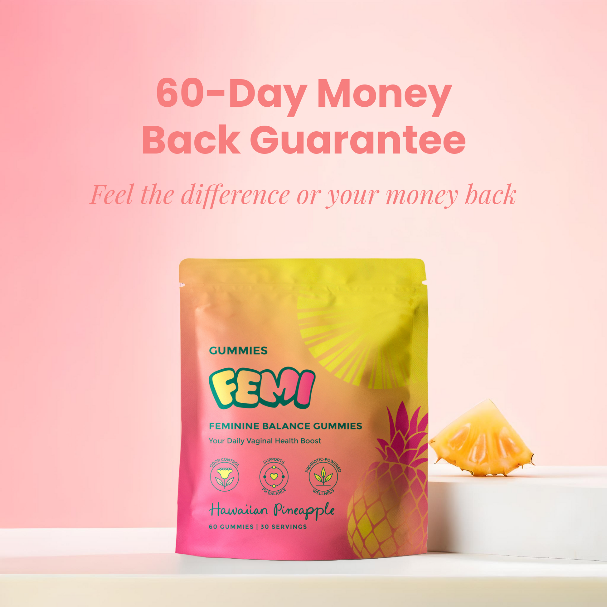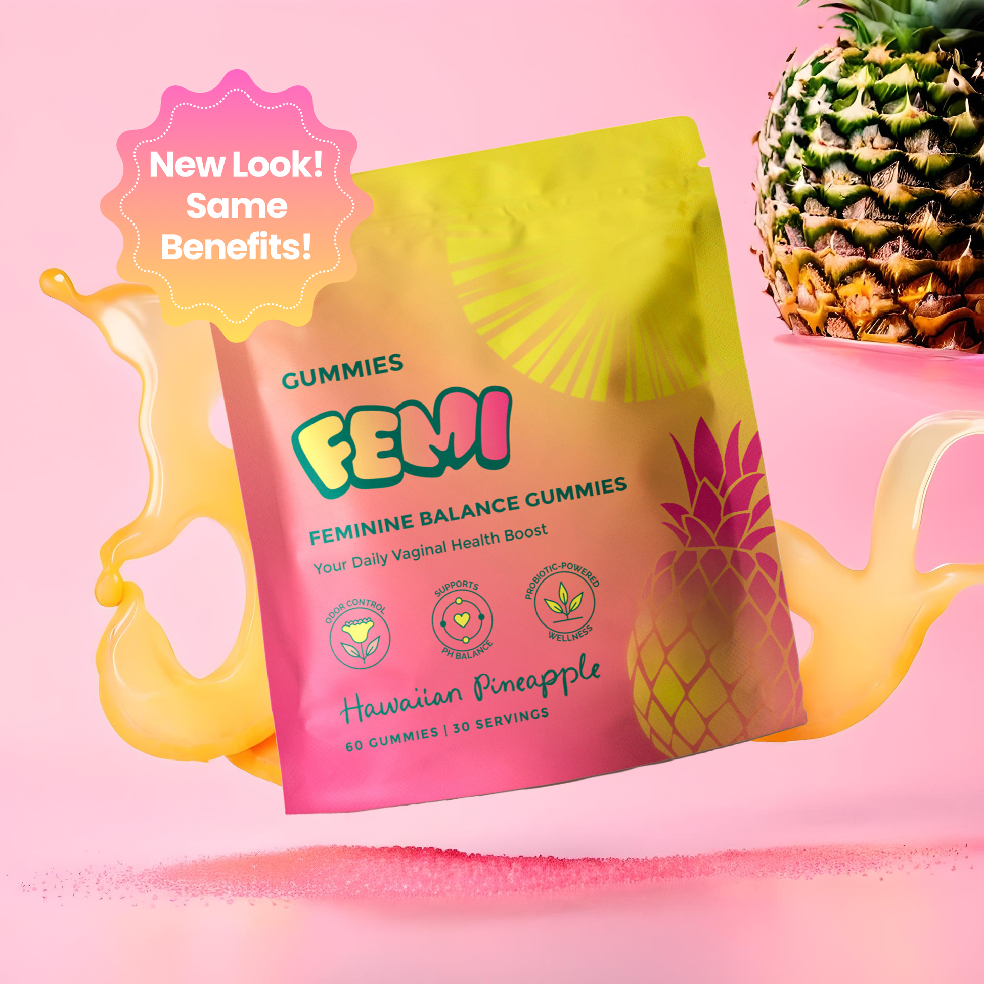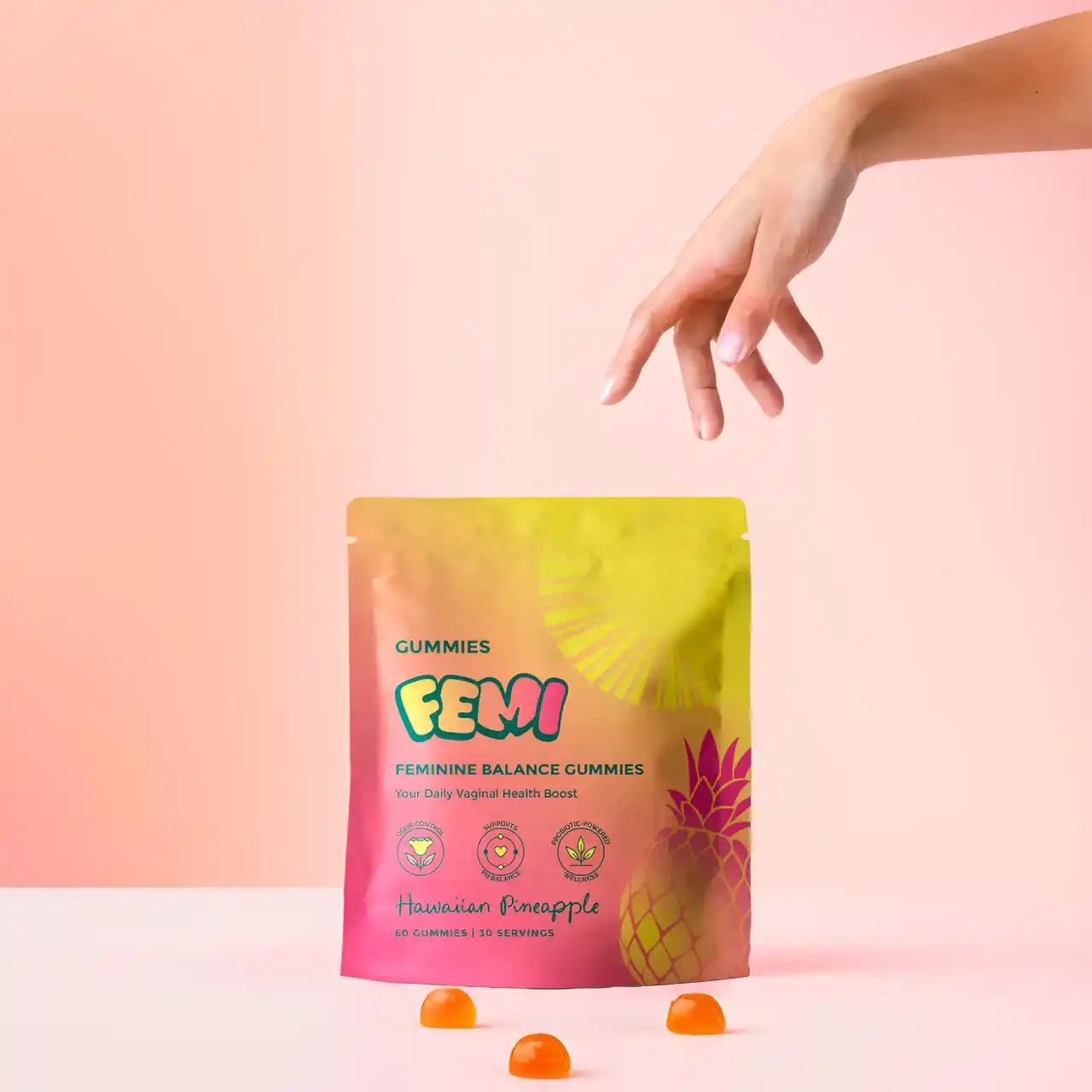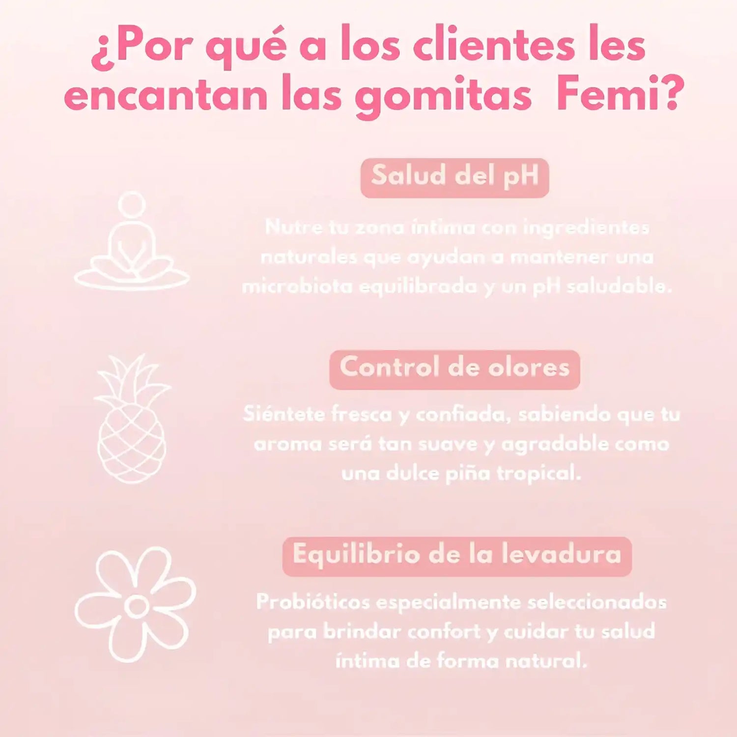 Las gomitas Femi son suplementos diarios para el equilibrio femenino diseñados para apoyar el equilibrio del pH, la salud vaginal y la defensa inmunológica con ingredientes naturales como la piña y el Bacillus Coagulans.