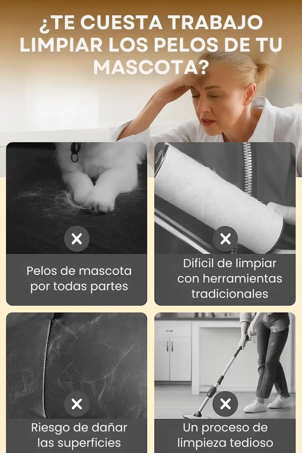 Atrapa fácilmente los pelos de tus mascotas en ropa, sofás, alfombras y cualquier superficie, dejándolas como nuevas con una sola pasada.