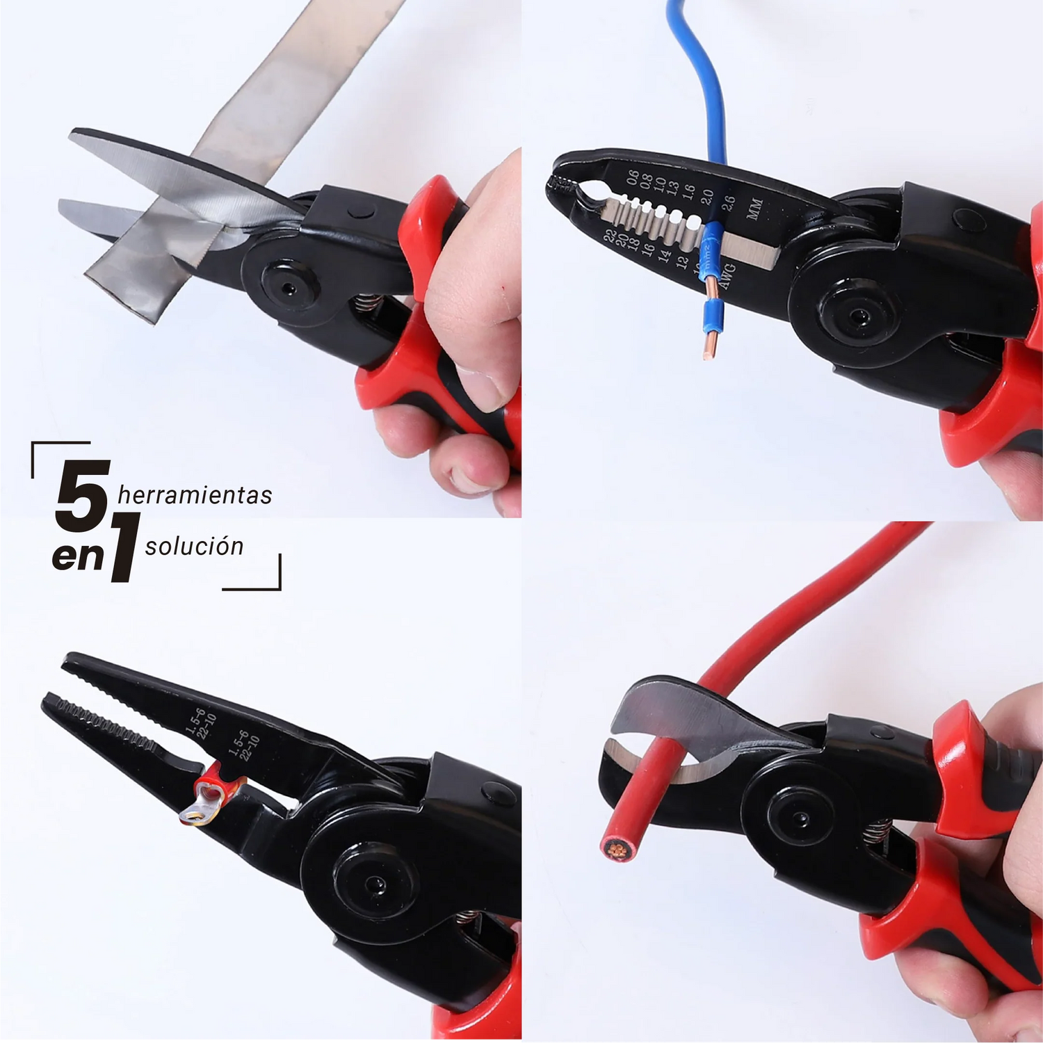 El alicate multifuncional 5 en 1 está diseñado para cortar una variedad de materiales, incluyendo cables de diferentes tamaños, alambres y láminas. Su construcción en acero inoxidable asegura cortes precisos y sin esfuerzo.