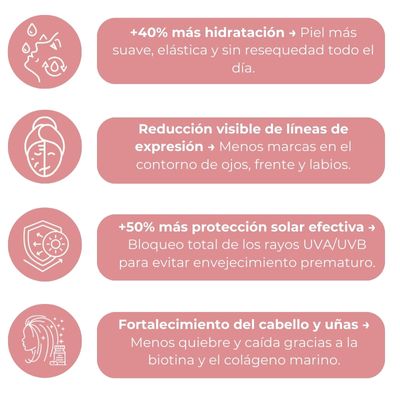 -Para prevenir el envejecimiento prematuro → La combinación de SPF90 y colágeno protege y mantiene la piel joven.