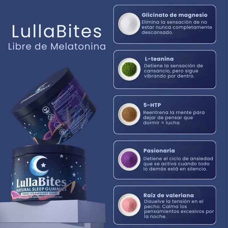 LullaBites™ ayuda a romper ese ciclo: su fórmula natural con valeriana, pasiflora, L-teanina y magnesio calma tu mente, relaja tu cuerpo y te prepara para dormir profundamente, sin melatonina, sin hormonas y sin dependencia. 🌙✨