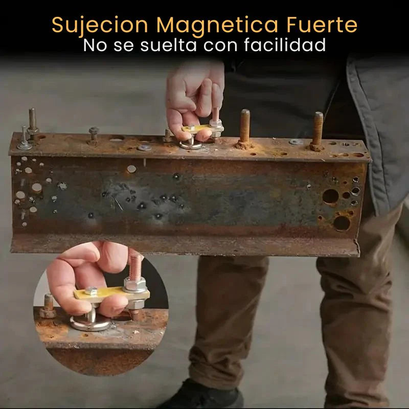 ✅ Cuenta con un imán permanente de alta potencia que soporta hasta 15 kg de fuerza, lo que garantiza una sujeción estable y segura incluso en superficies oxidadas, curvas o con vibración. No se desliza ni se afloja mientras trabajas, brindándote total confianza en cada soldadura.