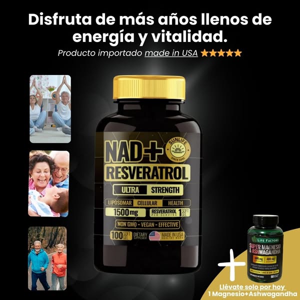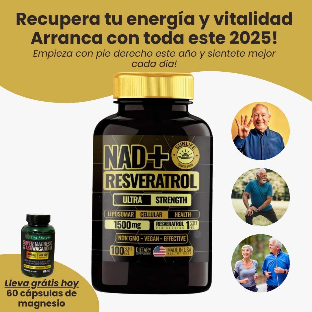Esta poderosa fórmula NAD+ Resveratrol trabaja desde el interior, ayudando a tus células a regenerarse, reducir la inflamación y producir más energía.