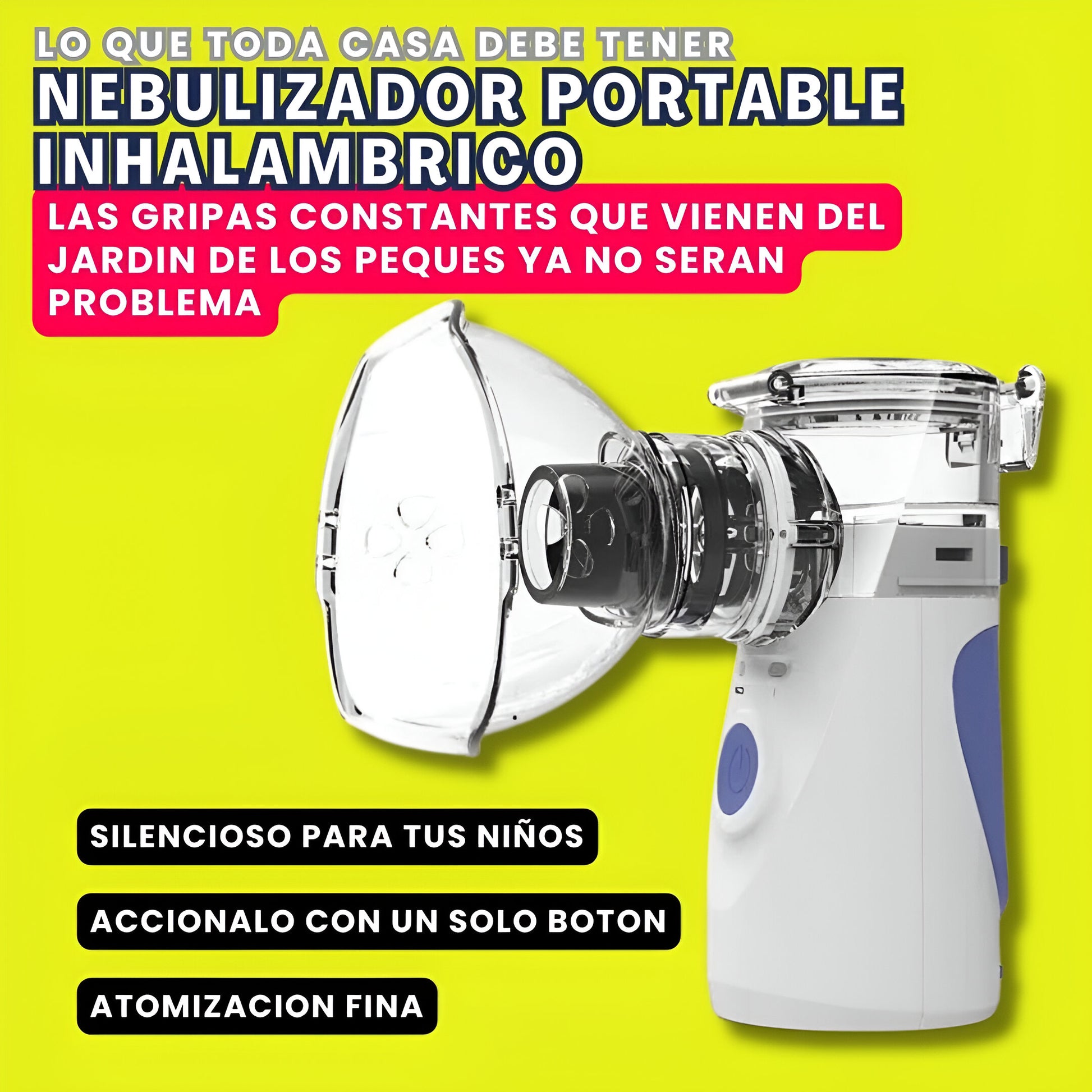 Te presentamos nuestro Nebulizador Portátil, Ultra Silencioso, la solución perfecta para adultos y niños que buscan un alivio rápido y eficaz de las afectaciones respiratorias.