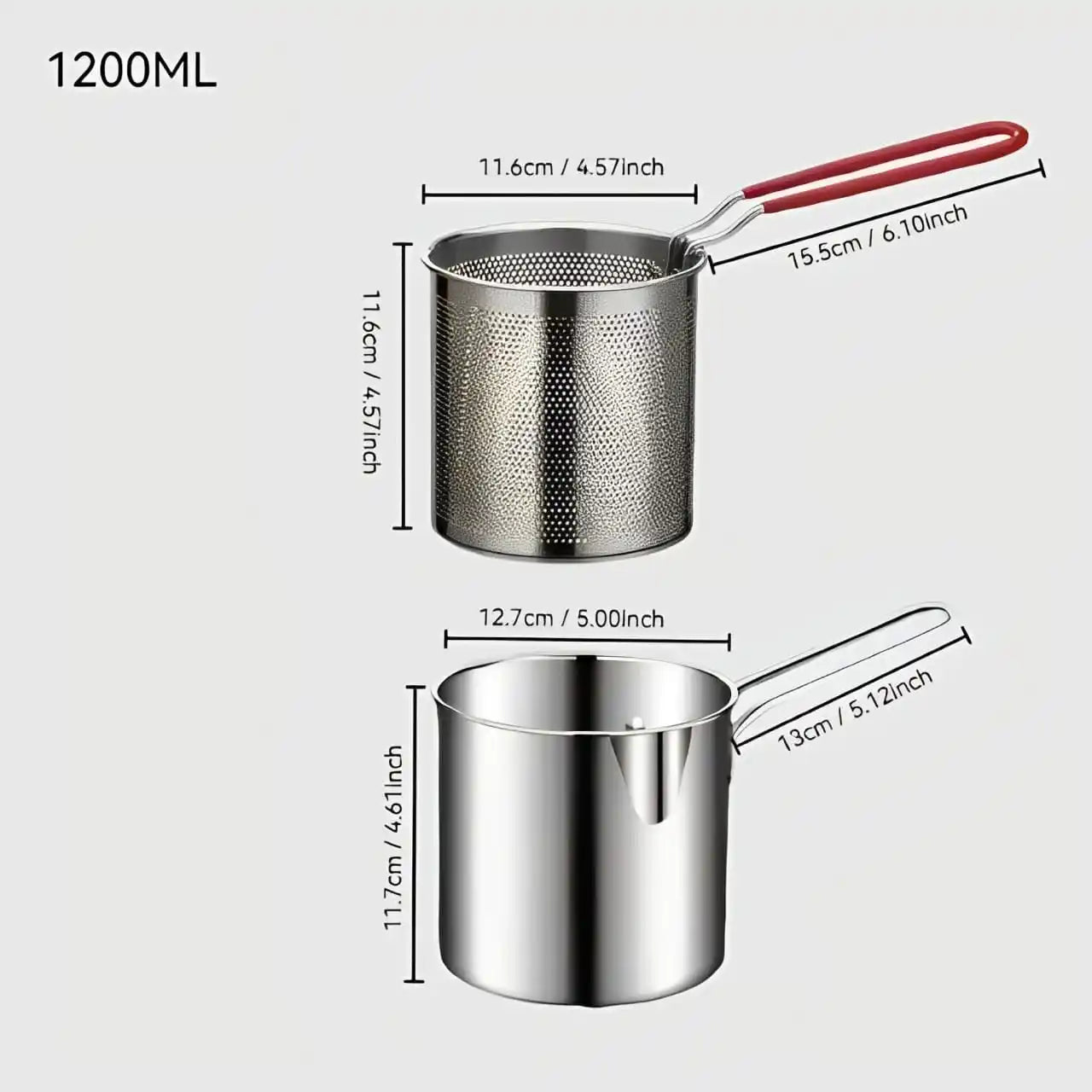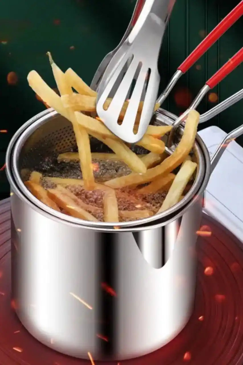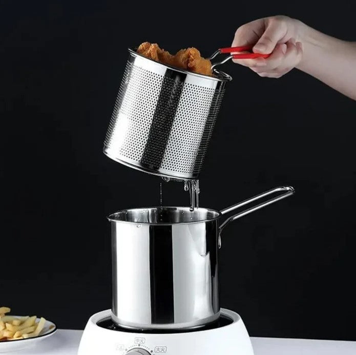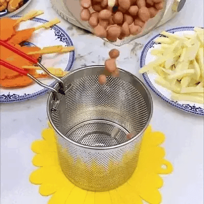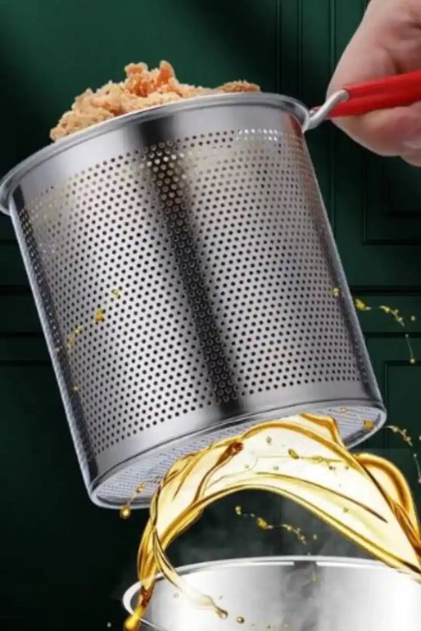 Canastilla escurridora en acero inoxidable que facilita la extracción y el drenaje eficiente del aceite, mejorando la textura final del alimento.