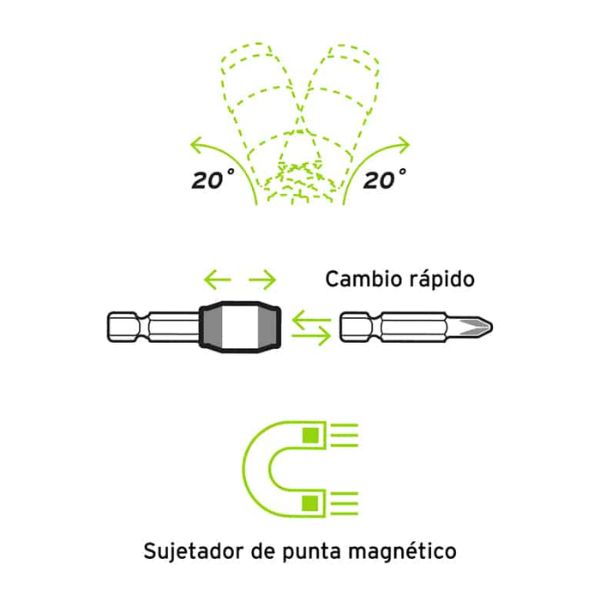 Permite intercambiar las puntas con una rapidez y sencillez nunca antes vistas. Esta eficiencia te mantiene concentrado en lo que realmente importa: completar tus proyectos con precisión y velocidad.