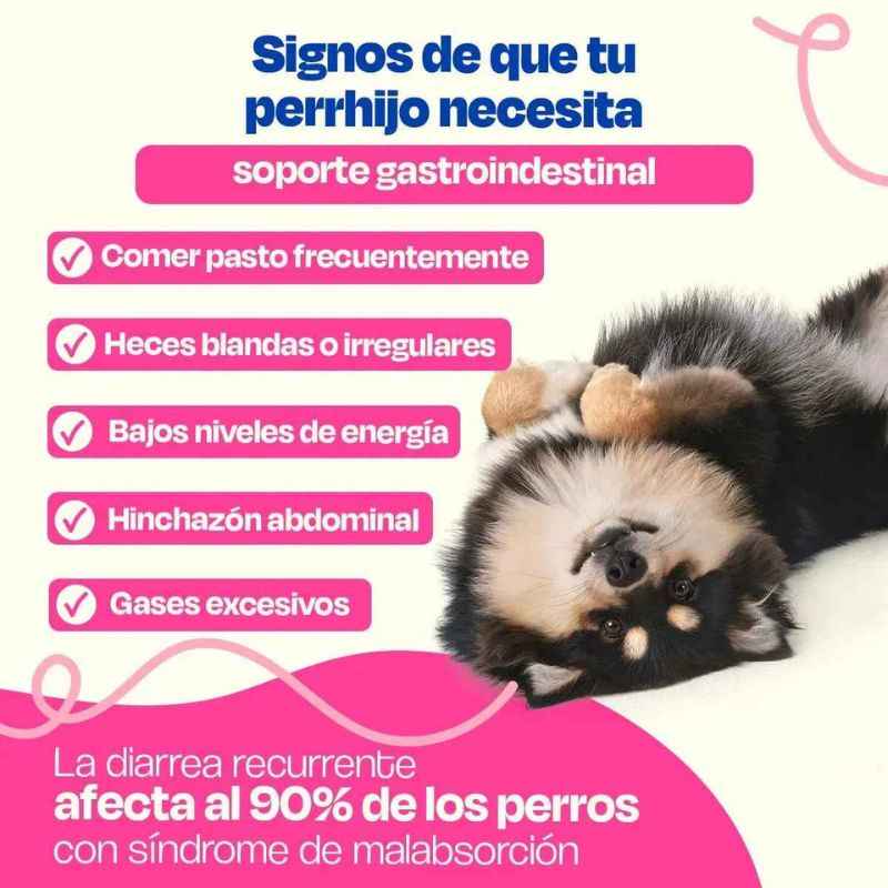 Es un suplemento con sabor a pescado que contiene prebióticos y probióticos (+3 Billones de UFC) para equilibrar la flora intestinal, mejorar la digestión, la absorción de nutrientes y apoyar un sistema inmunológico saludable en los perros.