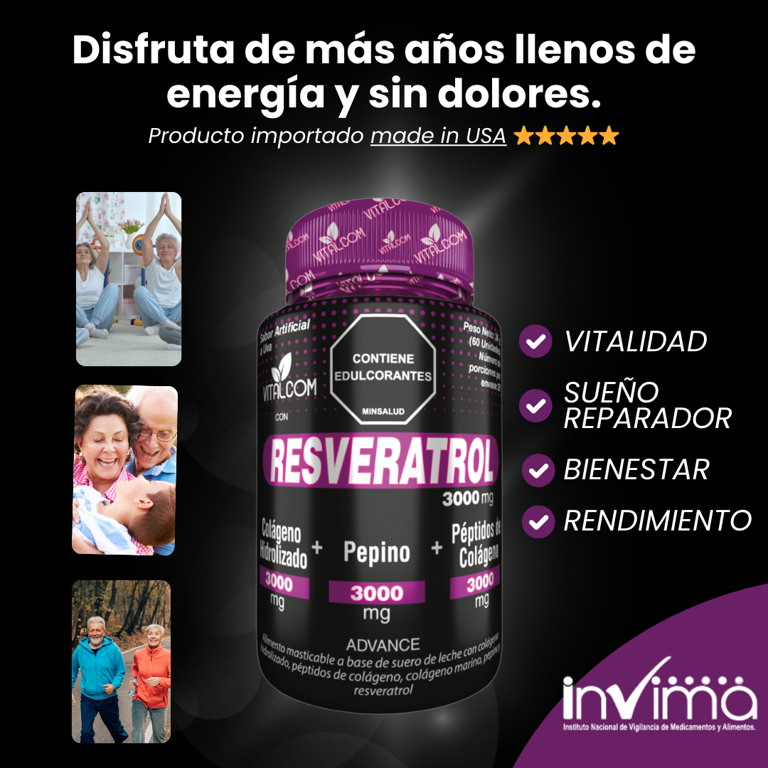 La combinación de Resveratrol, Colágeno Hidrolizado y Péptidos de Colágeno mejora la energía, apoya la reparación del ADN, protege el corazón y combate el envejecimiento celular. Juntos, optimizan la regeneración de tejidos, mejoran la elasticidad de la piel y la flexibilidad articular, favoreciendo la salud celular y el bienestar general a largo plazo.