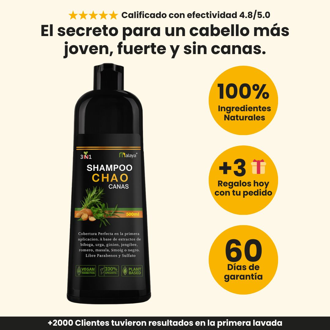 Los tintes comunes solo pintan superficialmente, resecan el cabello con químicos agresivos y requieren mucho tiempo y dinero en peluquerías. Te presentamos Chao Canas: un shampoo innovador que lava, nutre y cubre las canas mientras cuida tu cabello.