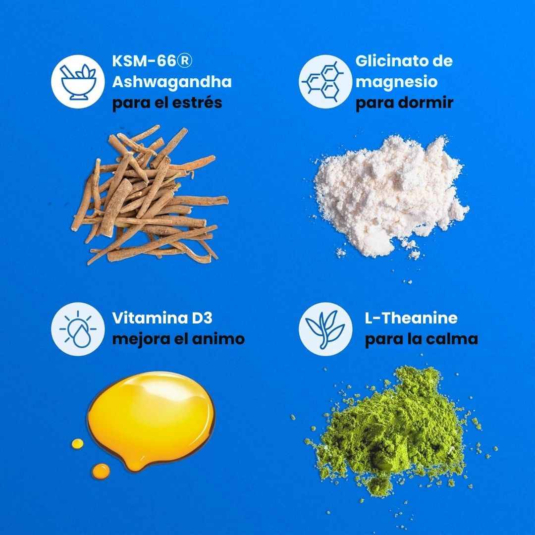 ✅ Ingredientes principales: Ashwagandha KSM-66, Magnesio glicinato, L-Teanina, GABA