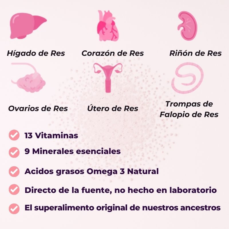 Nuestra mezcla de órganos de res 100% reales aporta vitaminas, minerales y nutrientes que tu cuerpo reconoce y absorbe fácilmente, ayudando a regular tus hormonas, apoyar la salud reproductiva y promover una energía estable durante todo el día.